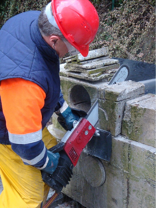 Алмазные цепные пилы предназначены только для «мокрой» резки. Шина имеет специальную конструкцию с расчетом на поток воды вдоль всей линии реза. Вода вымывает шлам и охлаждает цепь.